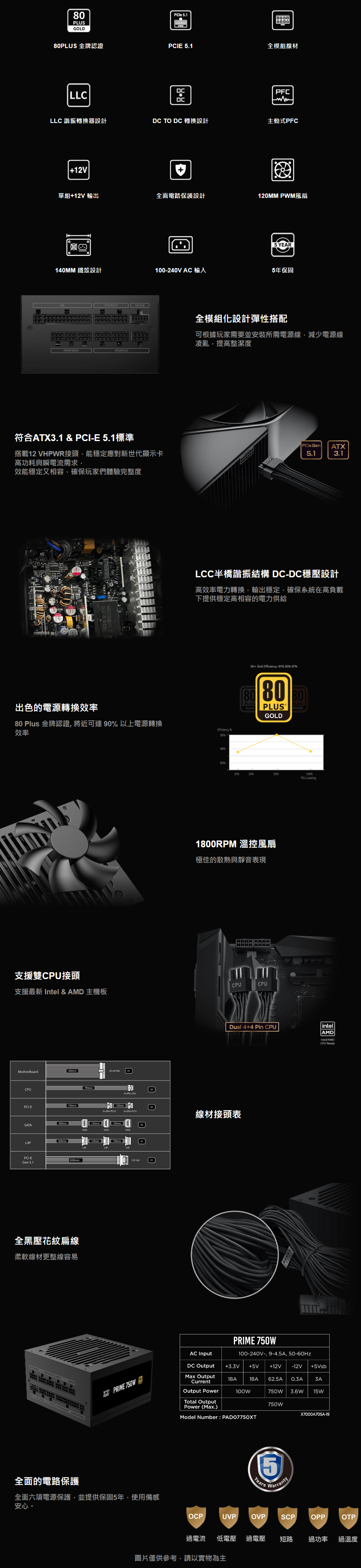 Xigmatek Prime 750W 80+金牌/扁線/全模/DC to DC/主動式PFC/PCIe 5.1/5年保